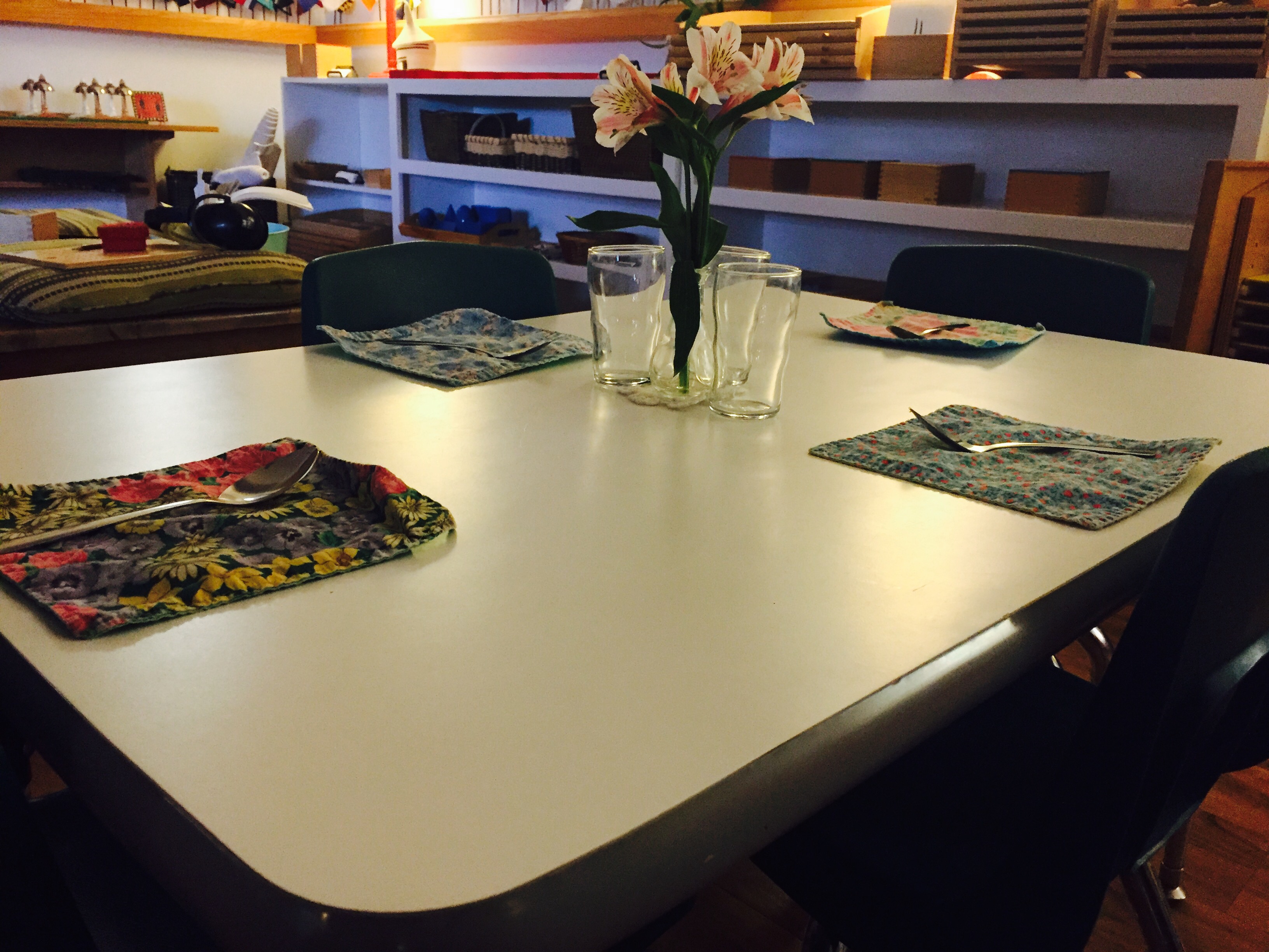 Preparation for lunch is done by the children – setting tables with plates, glasses, cloth napkins, silverware and fowers. Children serve themselves either buffet style or family style. After lunch the children are responsible for cleaning up their own space.
